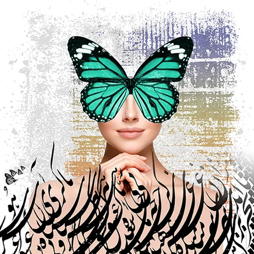 One of my own favourite pieces. The first piece I created, printed and hanged on my flat wall. “Parvanegi” means “being a butterfly” in Persian language. The persian calligraphy used here is neither a poem nor a quote. It is referred as “Siyah mashq” in persian language meaning “Black practice”. Siyah mashq was originally just a practice for the calligrapher to warm up his hand and to refine the shape of letters by repeating them over and over. These practices resulted in a page filled with words and letters with repetition regardless of meaning, all for the sake of composition and style.